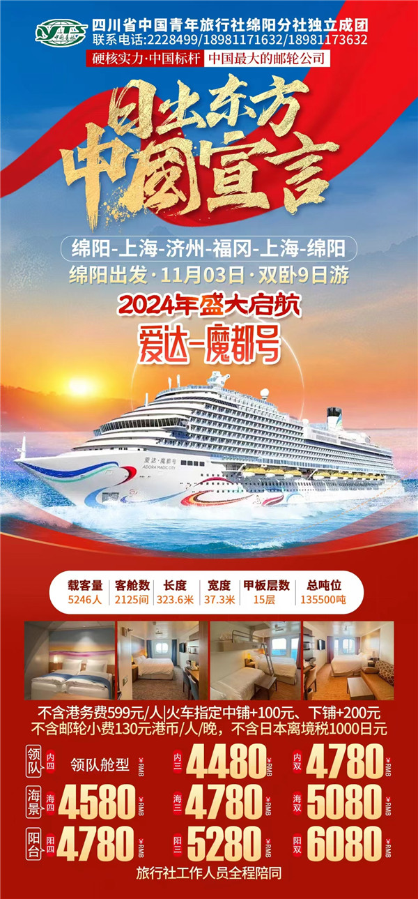 綿陽中旅假日旅行社于2024年10月9日在市工會(huì)大廈成功舉行“愛達(dá)·魔都號豪華郵輪9日游”旅游線路推薦會(huì)?,F(xiàn)場主持人向到場的嘉賓們詳細(xì)的介紹了濟(jì)州、福岡等地的風(fēng)土人民、美食、美景以及出游的相關(guān)注意事項(xiàng)等內(nèi)容,受到了嘉賓們的熱烈歡迎和關(guān)注。服務(wù)熱線:0816-2228499/2238477 。